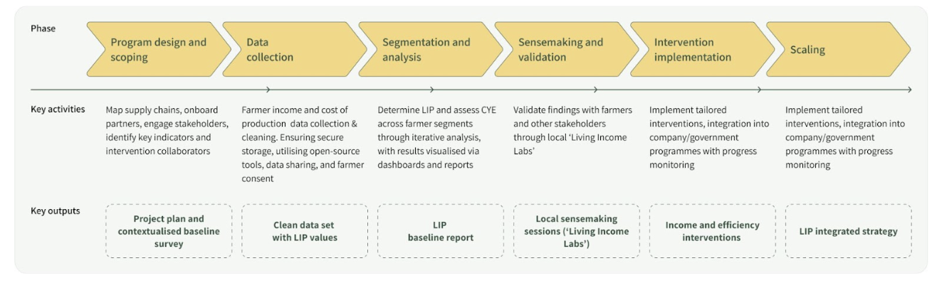 At its core, our joint approach combines two complementary methodologies:- Living Income Price (LIP). Calculates a price floor that enables a decent standard of living for producers, whether at farmgate, cooperative, or Free-on-Board (FOB) level. By comparing current prices with a living income benchmark, it reveals how far the supply chain must move.
