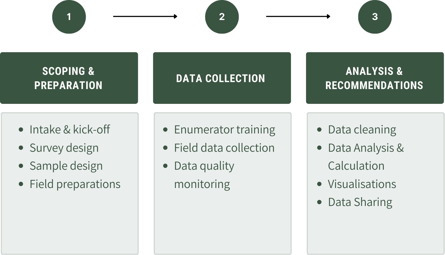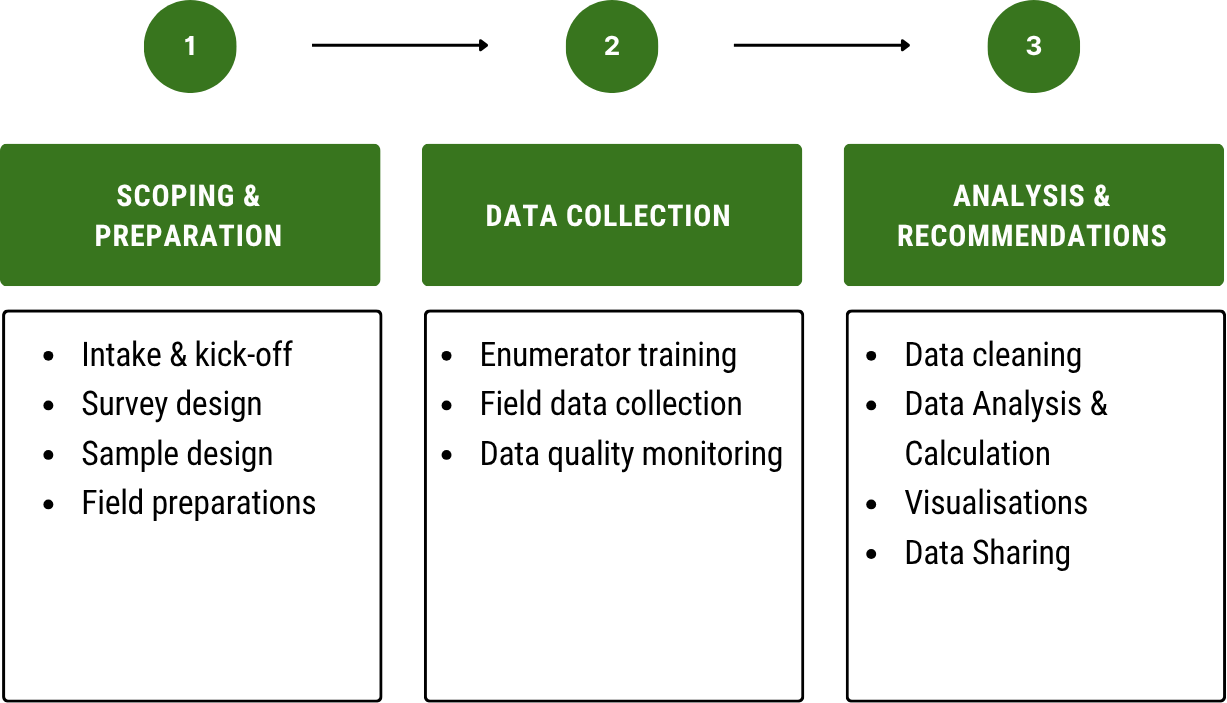 The Living Income Price (LIP) analysis follows a clear three-phase process: Scoping and preparation, Data collection, and Analysis and recommendations. Each phase includes key activities that build toward a robust and context-specific LIP outcome. During the Scoping and preparation phase, users define the goals, design the survey, and prepare for fieldwork. In the Data collection phase, enumerators are trained and fieldwork is conducted with ongoing data quality monitoring. Finally, the Analysis and recommendations phase involves cleaning and analysing the data, generating key insights, and visualising results in a final slide deck. This structured process ensures that the LIP analysis is both rigorous and practical, while remaining adaptable to different local contexts.