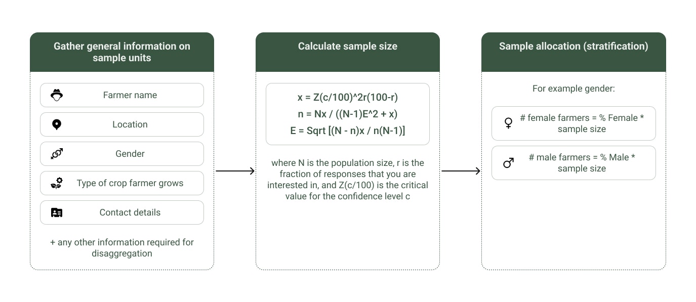 - Population frame: To determine the appropriate sample size, the M&E local team needs a comprehensive list of all the farmers involved in the project. This list serves as the foundation for defining the population frame—the group of individuals from which the sample will be drawn. The population frame should be as complete and accurate as possible, encompassing all relevant farmers within the scope of the project. If there are multiple project locations or distinct groups within the farmer population (e.g., different farming practices, crops, or regions), the sampling approach may need to be stratified to ensure that these variations are adequately represented.